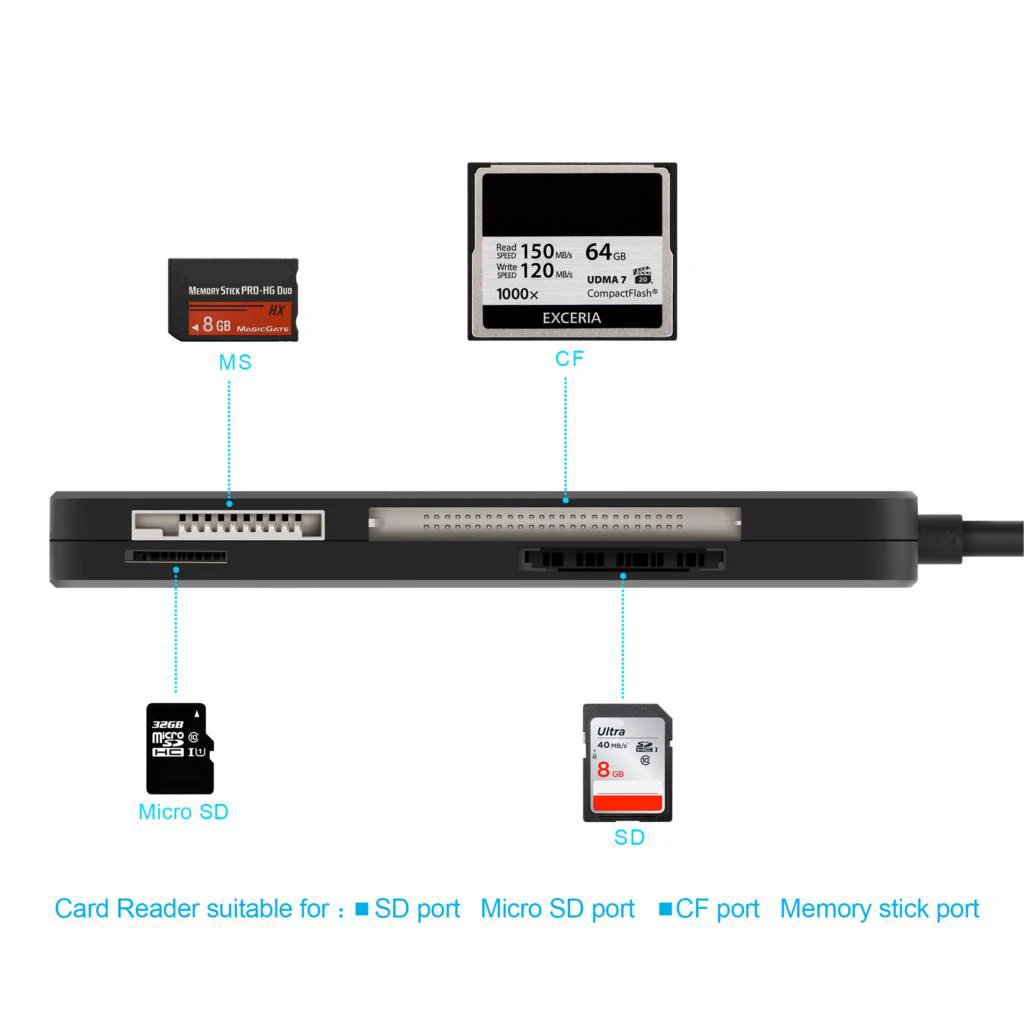 2,Card Compatibility: supports SDXC, SDHC, SD, CF, High-Speed CF (UDMA), MS, Micro SDXC, Micro SDHC, Micro SD cards.