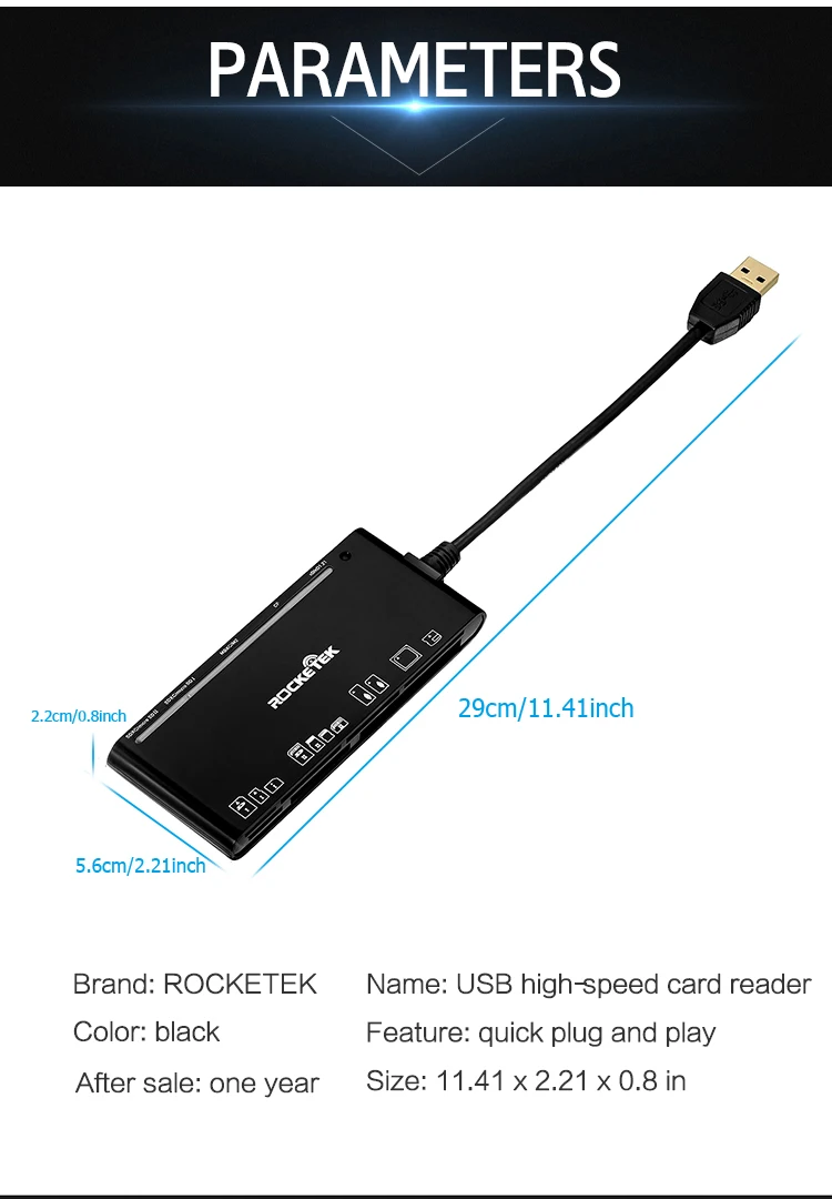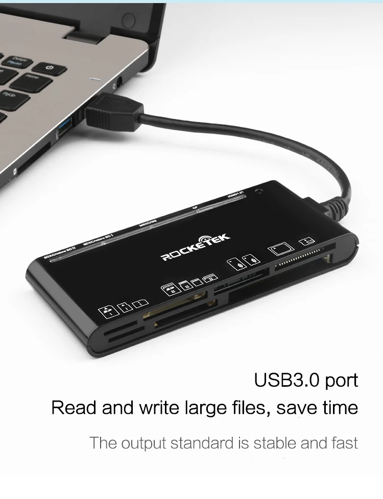 RT-CR7 Multi-in-1 SuperSpeed USB 3.0 Card Reader allows you to easily add a USB 3.0 multi-slot card reader/writer to your USB 3.0 enabled system. The Rocketek USB 3.0 SD / Micro SD / CF Card Reader is a great option for anyone looking for an easy way add support for the most common storage media types used in common digital cameras, MP3 players, and mobile phones,etc.