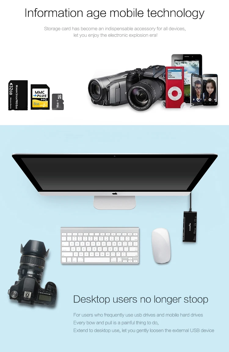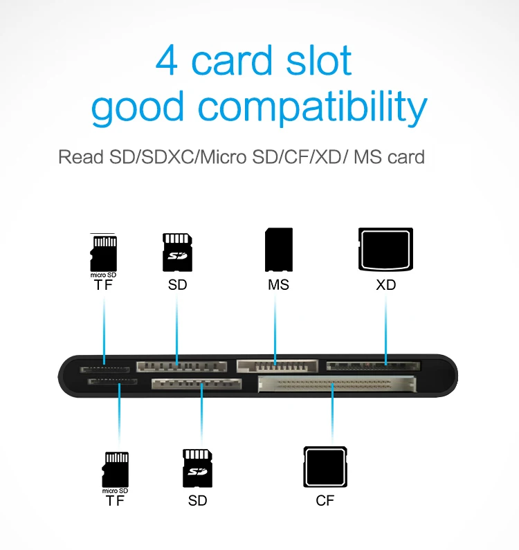 -8 slots: SD*2(SDXC/SDHC/SD/MMC) + Micro SD*2(Micro SDXC/Micro SDHC/Micro SD) + CF(UDMA) + MS(support MSXC) + xD/xD1.21