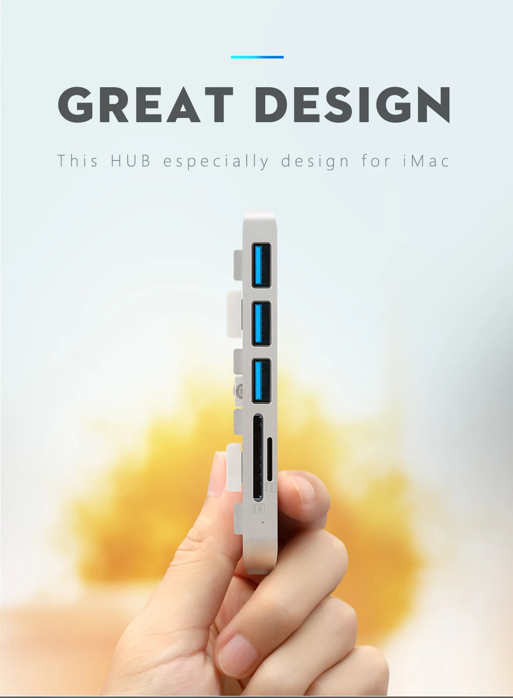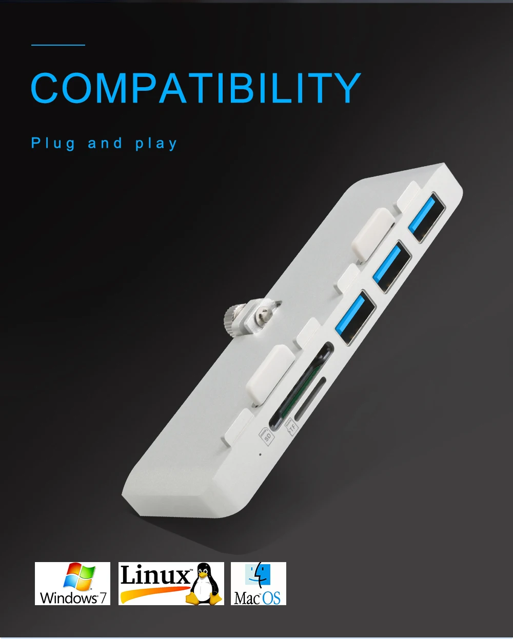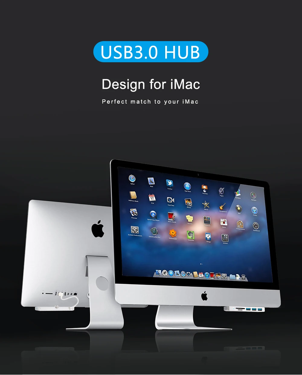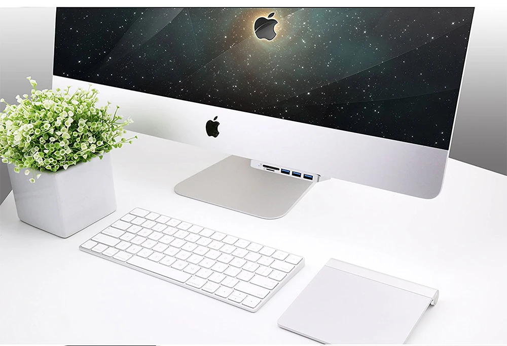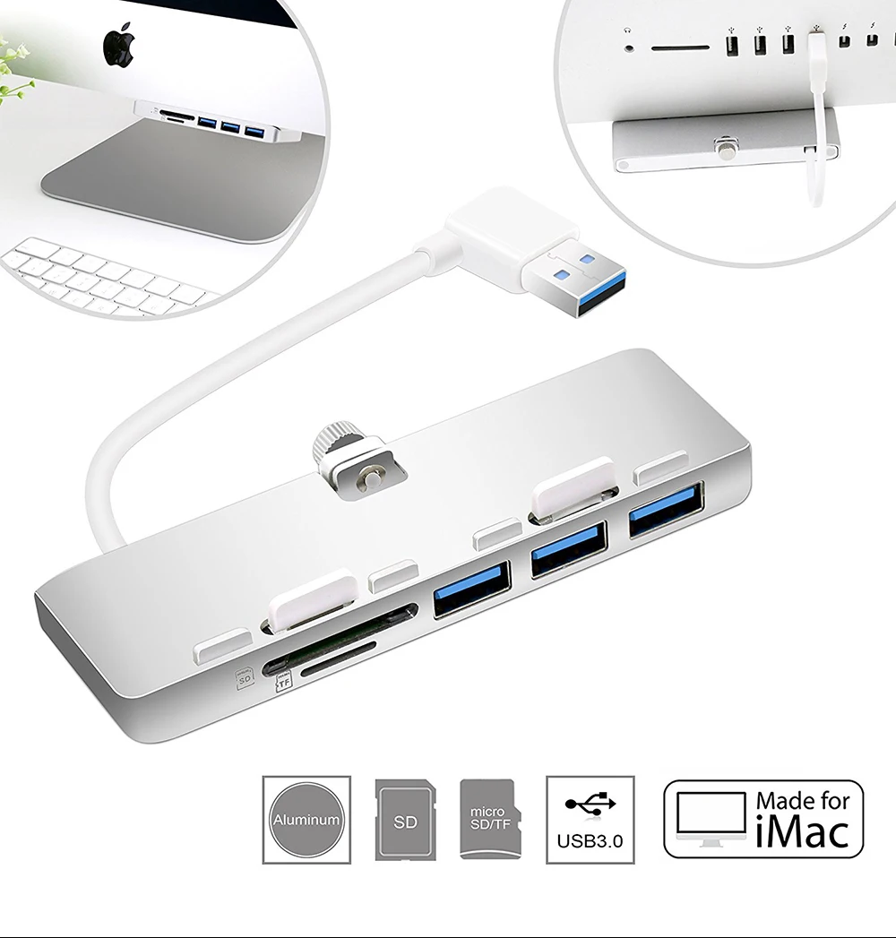 Rocketek ultra-thin premium aluminum 3-Port USB 3.0 hub with SD/TF card reader combo is exclusively designed for iMac. It adds three USB 3.0 ports and SD/TF card reader slots to the front side of your iMac. There is no more need to twist cables to get to the ports vertically. Now you can easily access USB ports and additional 2 slots card reader at an ergonomic angle! Its sleek aluminum design the perfect complement to your iMac computer. It does not require any software or complicated installation process. With a slim design, it saves you precious desktop space.