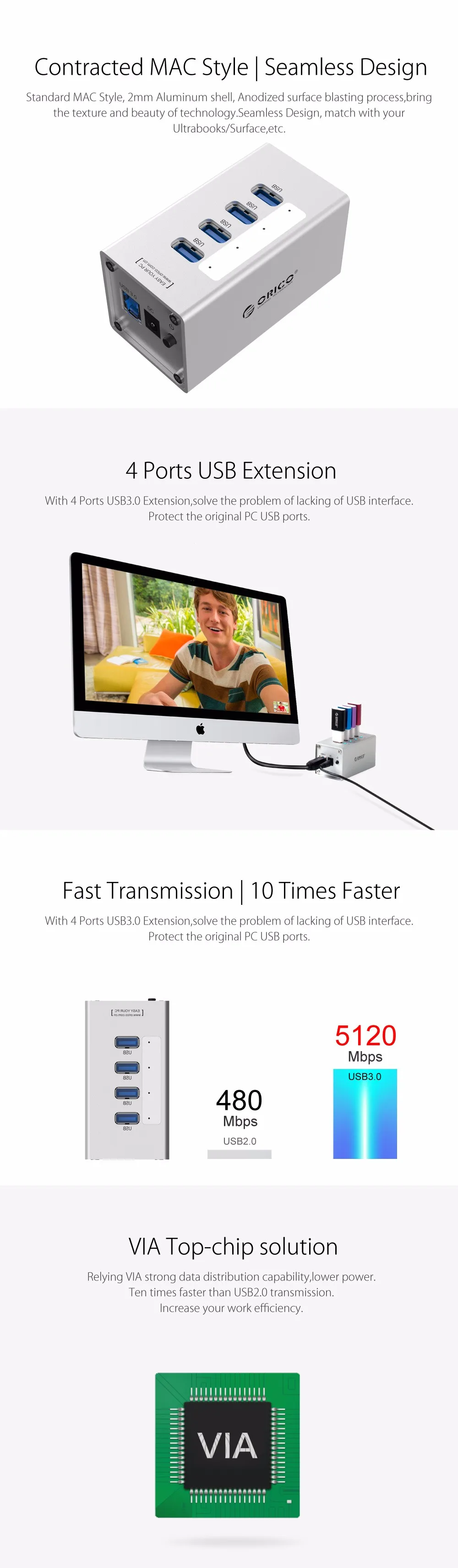 Best Price - ORICO Aluminum 4 Port USB 3.0 HUB High Speed 5 Gbps Multi USB Splitter Laptop Accessorie with 12V Power for Computer PC (A3H4) Best Price