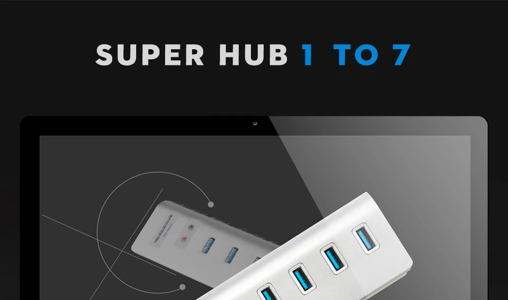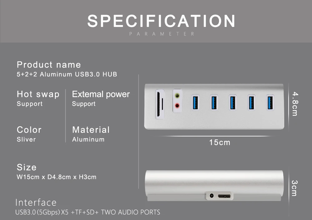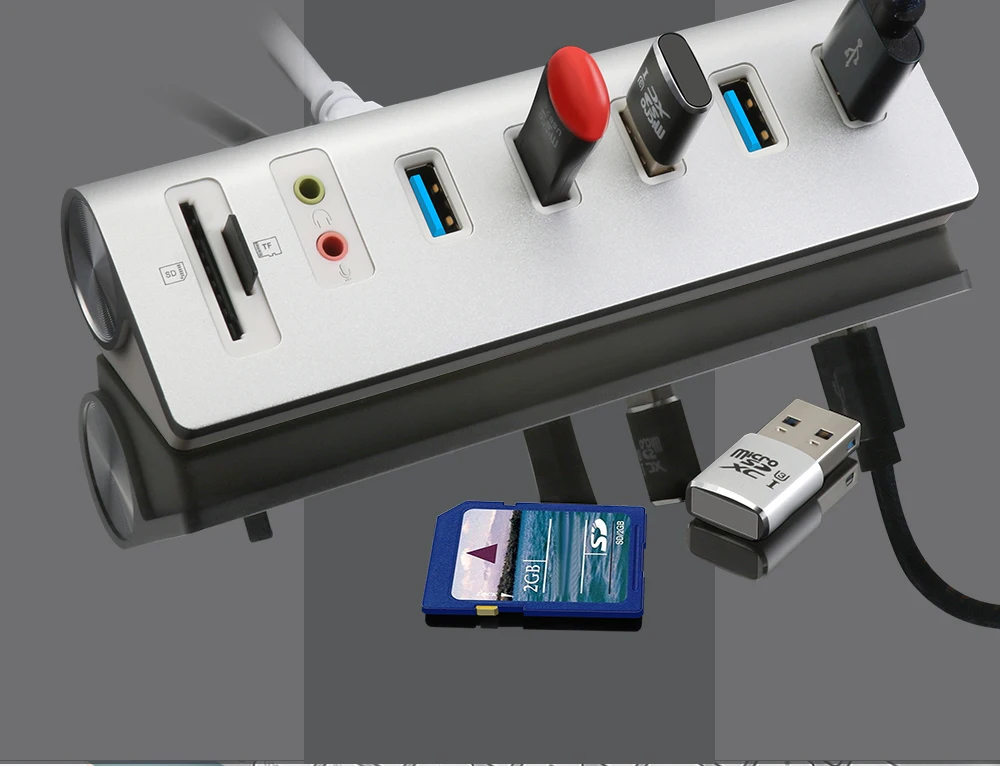 The Cateck 5 USB 3.0 Aluminum Hub with External Stereo Sound Adapter and SD/TF card reader combo is designed especially for laptops, tablets, and ultrabooks and expands one USB 3.0 high-speed port into five easily.