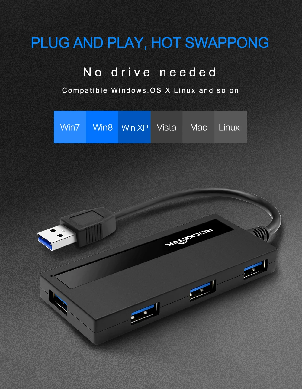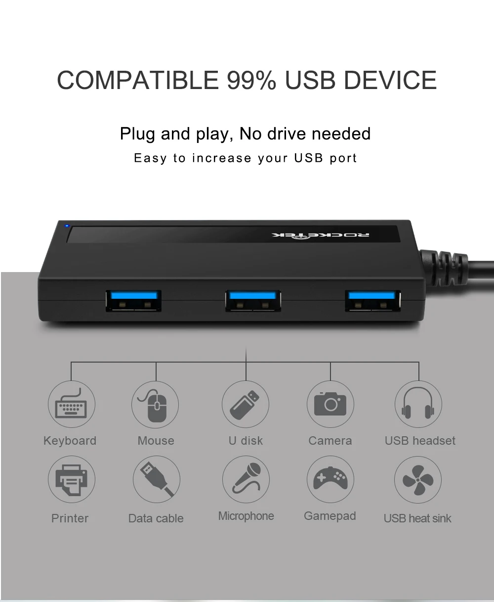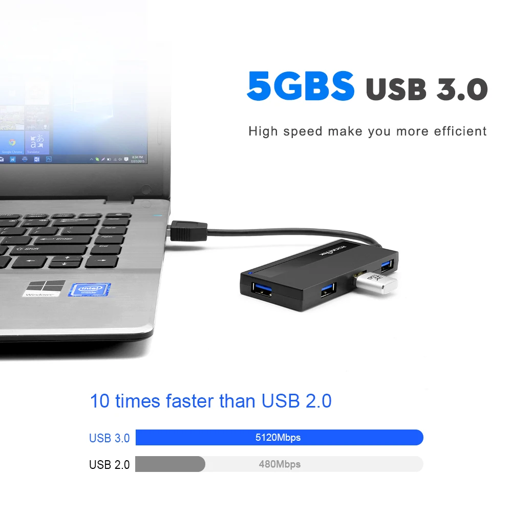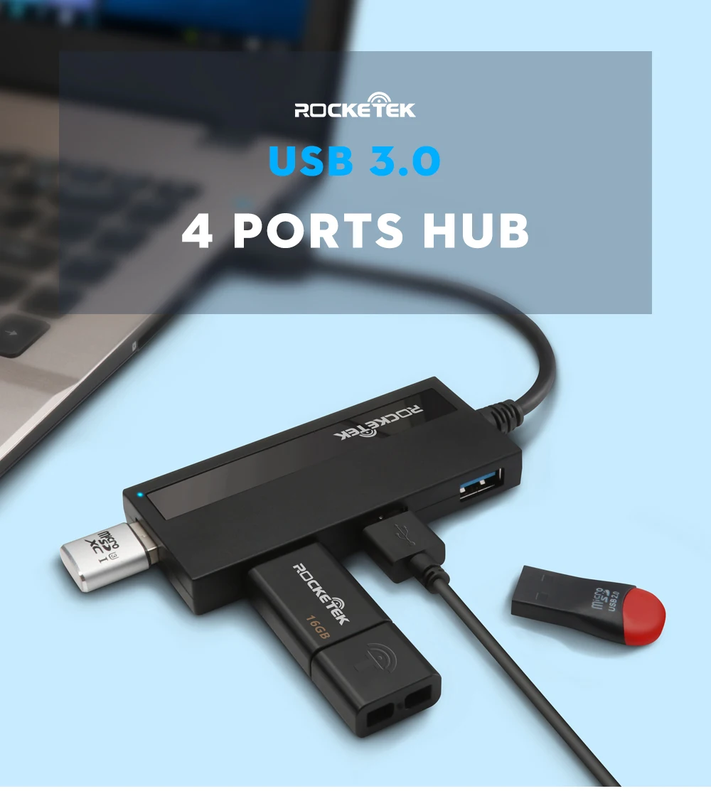 The Rocketek Ultra Slim 4 port USB 3.0 data hub adapter is designed especially for laptops, tablets, and ultrabooks and expands one USB port into three easily.