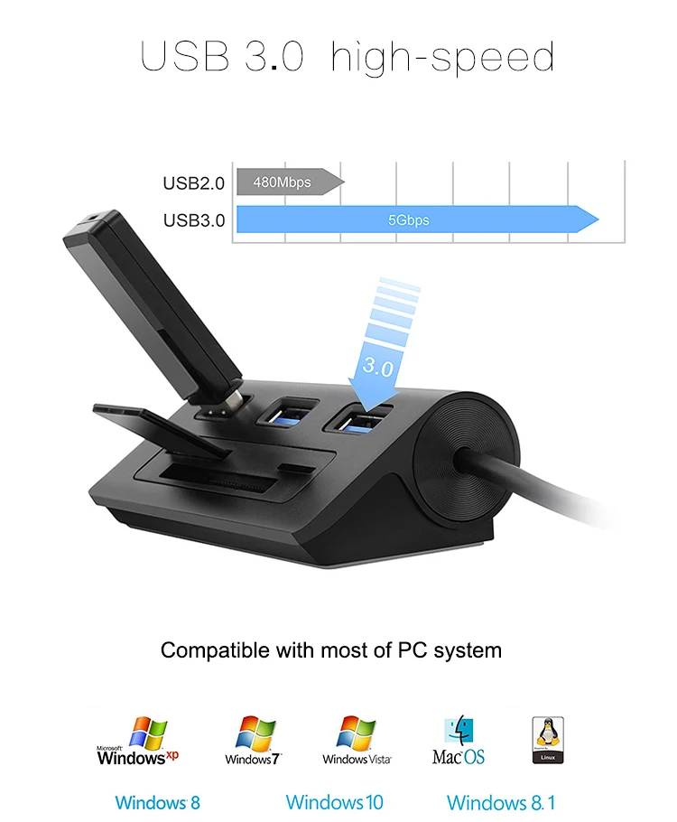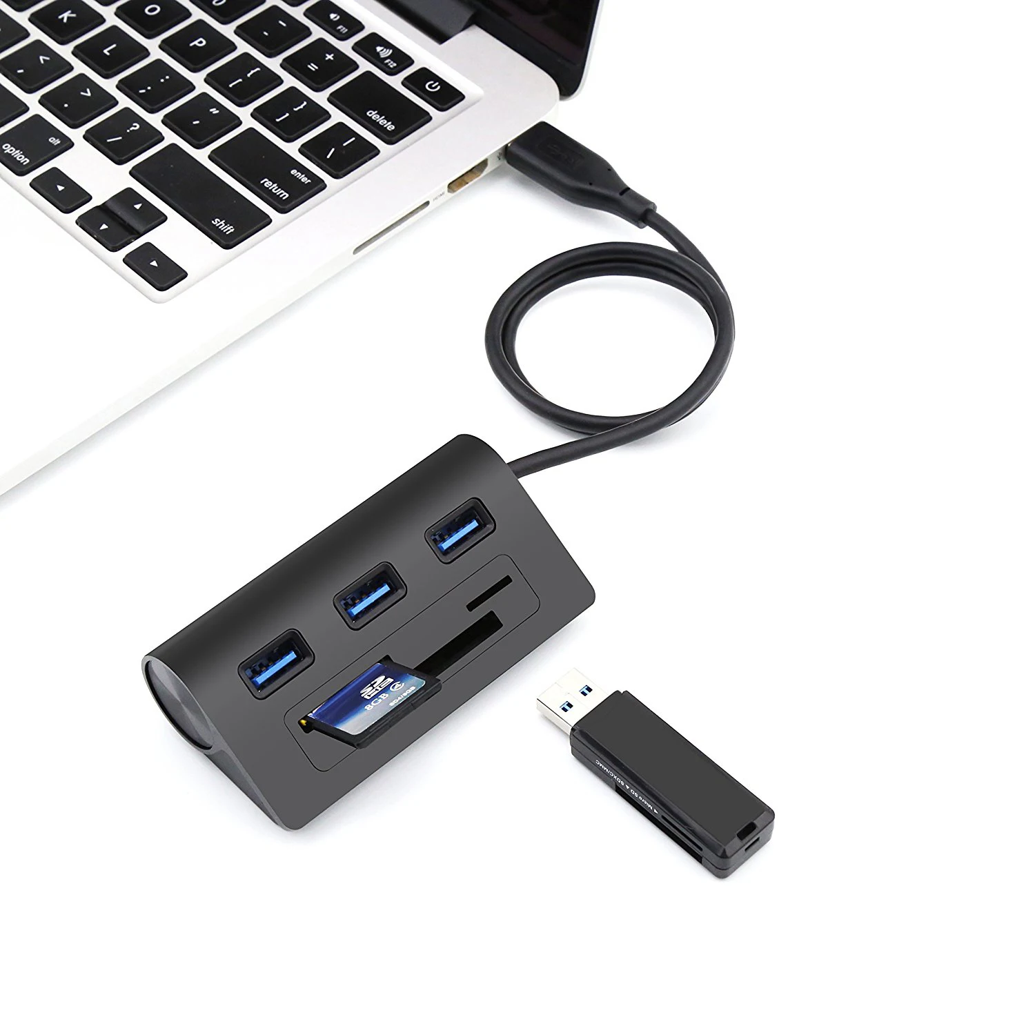 Cateck USB 3.0 hub with card reader is designed especially for laptops, tablets, and ultrabooks and expands one USB 3.0 high-speed port into three easily.