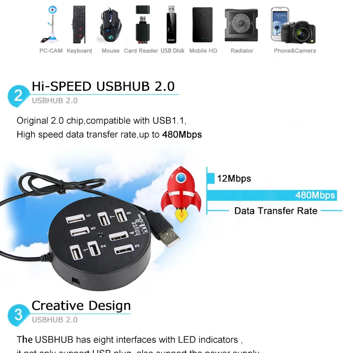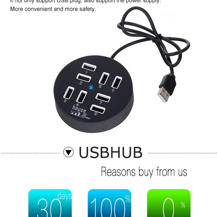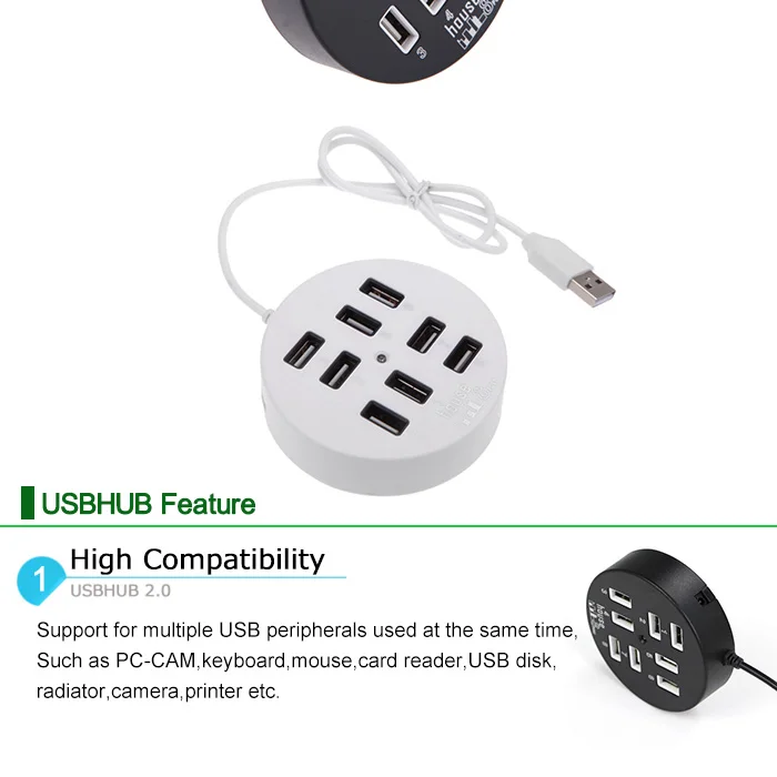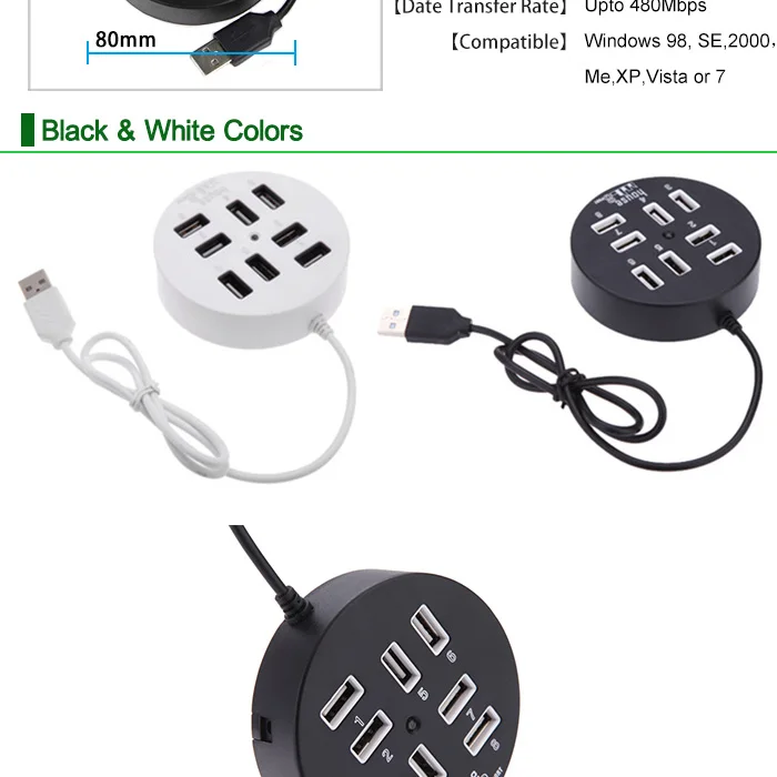 >Designed with 8-port,this compact USB2.0 high-speed hub is small enough for travel,and cable enough to meet your connectivity needs