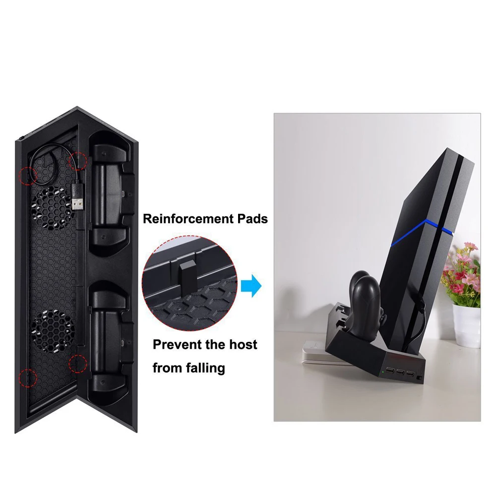 Universal PS4 Console Vertical Stand Fan Cooler keep your PS4/PS4 PRO/PS4 Slim cool and calm with the vertical cooling stand; Dual Charging station with 2 charger ports to charge both of your PS4 shock controllers simultaneously, saving your time when need to charge the controllers; 2 HUB and 1 USB ports with powerful output for data transferring and charging.