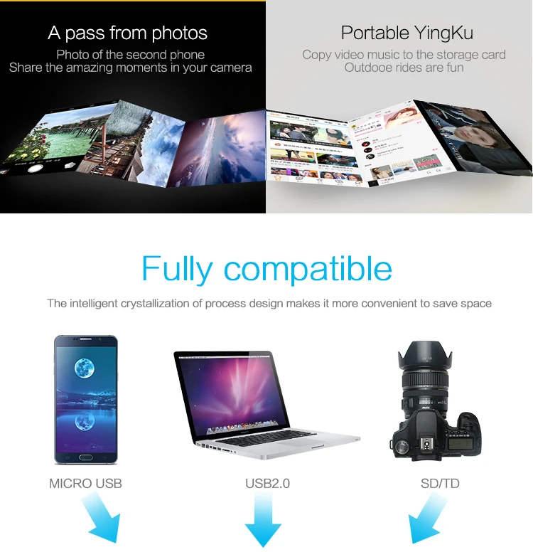 3. Support Device --- The standard USB 2.0 plug (type A) and micro USB plug (type B) combination, compatible with all PC and Android smartphones/tablets that support OTG function.