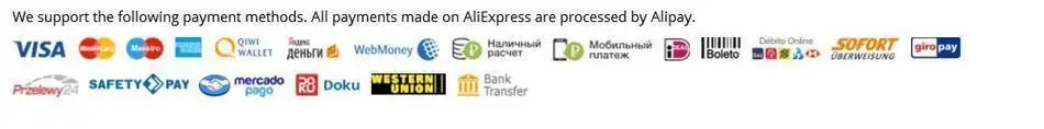 China Post Ordinary Small Packet Plus(Untrack): not registered, only have "picked up", "In transit" information in china on aliexpress shipping cainiao website, not "Arrived at destination" and "delivered", so there is no guarantee in this, the shipping time is 15-90 days normally, if you need urgently, then we advise you to choose other shipping way. AliExpress Standard Shipping(Recommended): we send the order to the aliexpress warehouse, they will find the best shipping way to your country, include china post air mail, singapore post, ePacket, Netherlands post and other post etc. China Post Registerd Air Mail & Singapore Post(Recommended): the delivery time is 15-60 days normally, brazil is 15-90 days, the delivery time isn't stable, it don't include the holidays or unforeseen matter, if the delivery time isn't enough, pls contact us to extend it for you, don't submit any dispute, thanks a lot. ePacket(Recommended): 7-15 working days normally, don't include holidays and delivery peak period, like 11.11 big promotion. (We can send to USA,Russian, Ukraine, New zeland, Australia, UK, Germany, Canada, France, Norway, Israel, Saudi Arabi, South Korea, Malaysia, Singapore, Austria, Belgium, Swiss, Denmark, Hungary, Italy, Luxembourg, Netherlands, Poland,Sweden, Turkey, Finland, Ireland, Portugal, Mexico, Brazil now) AliExpress Premium Shipping(Recommended): 7-15 days, we send the shipment to aliexpress warehouse. EMS courier(Recommended): 7-20 days normally, some countries is slower for 18-43 days. TNT/Fedex/UPS/DHL courier(Recommended): 3-10 working days normally, sometimes it take slower. => Payment1. We accept Alipay, West Union, TT. All major credit cards are accepted through secure payment processor ESCROW.