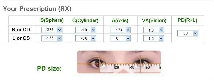 Please scan and send your prescription on the message center or under the order, the right prescription data include Sphere, Cylinder, Axis, PD and Addition(if have) etc., you can refer this sample, we can fix the order if you choose out the frame and lenses models to send you, the assembling cost is free as a special service, 100% quality guarantee.