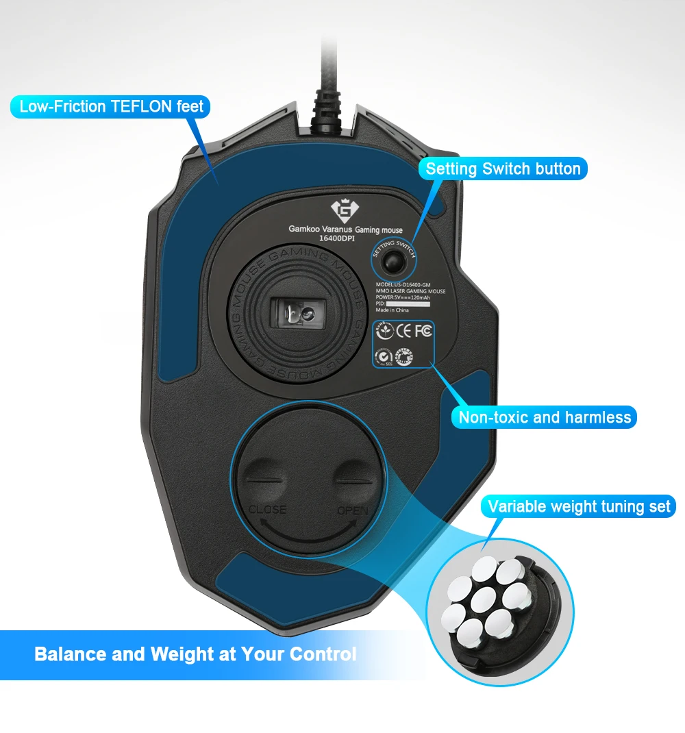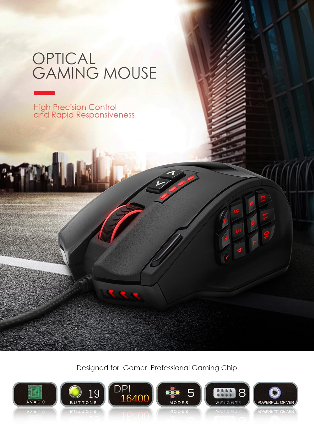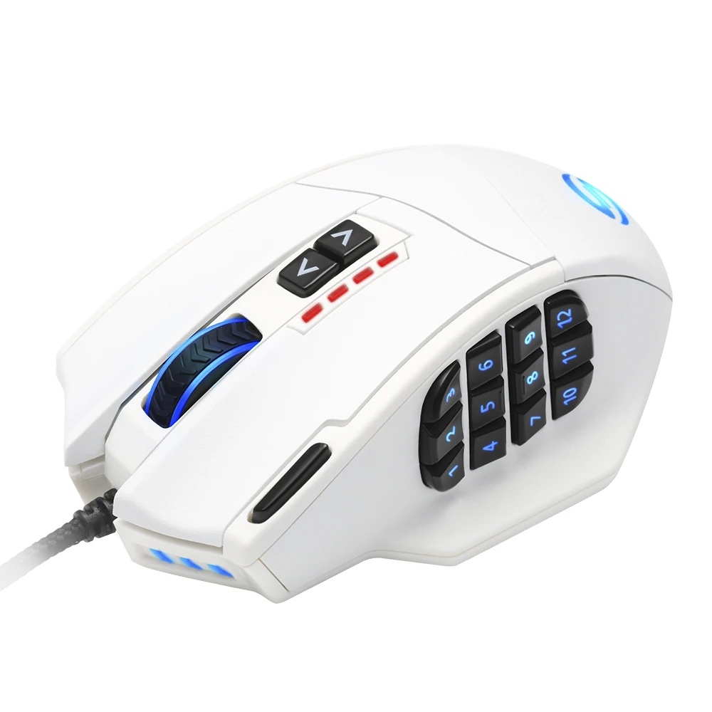 The Rocketek Venus MMO Gaming Mouse is outfitted with 16400DPI High Precision Laser Sensor that shifts the balance between the keyboard and mouse with its 19 MMO-optimized buttons, as well as 5 Savable Memory Profiles & 8-Piece Weight Tuning Set.