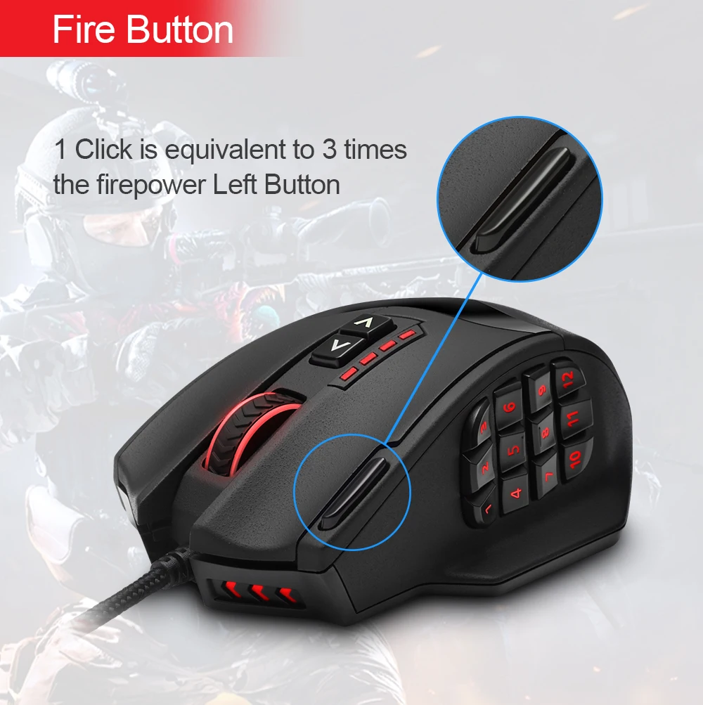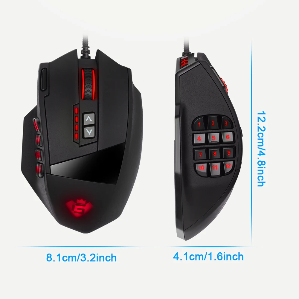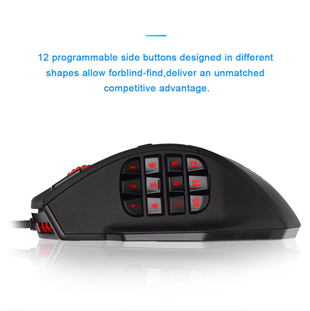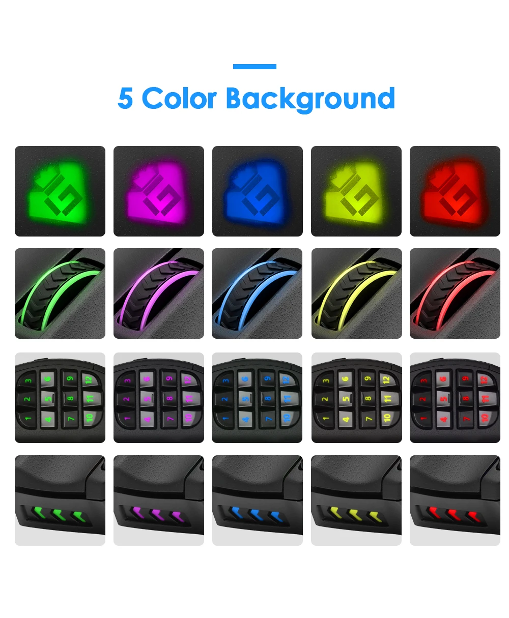 3.Durable smooth TEFLON feet pads and contour body for ultimate gaming control. High-end features including 18 buttons, power button, breathing light in 5 colors modes and 12 side buttons
