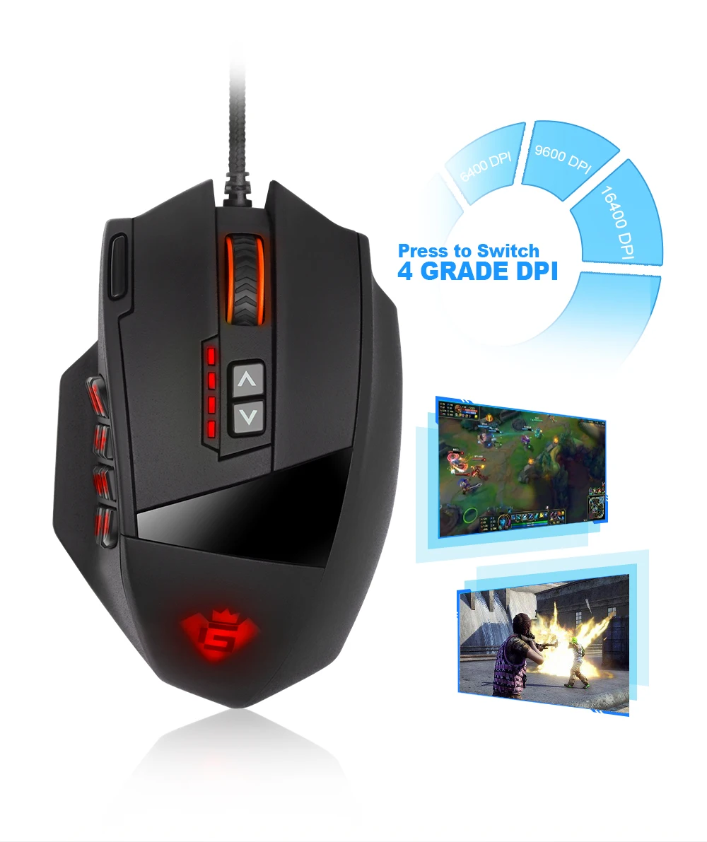 Make the right moves with up to 5 DPI settings that take you from pixel-precise targeting (50 DPI) to lightning-fast maneuvers (up to 16400 DPI). Easy to reach DPI+ & DPI- buttons on the middle of the Rocketek Venus MMO Gaming mouse. Five colors light will show you the change of DPI, can't remember? DPI indicator light is available.